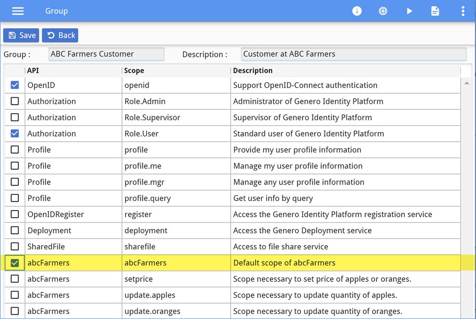 For each group, the administrator selects the scope of Role.User (for the Authorization API), as each member of these groups is a "standard user of Genero Identity Platform". In addition, the default scope openid (for the OpenID API) is kept, as it is required for the Genero Identity Provider and single sign-on. Figure 2 shows the initial scopes selected for the ABC Farmers Customer group; the scopes for the Worker and Manager groups would be identical at this stage.