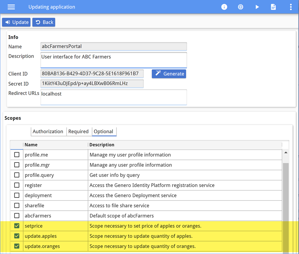 The administrator must determine which scopes are required and which are optional. For the ABC
