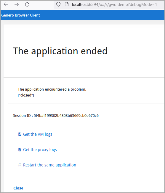 gasadmin close-session --session d98290172c8f7c0d861db329f1ce6597 -f as1.xcf --message "closed"Figure: Application ended page with message