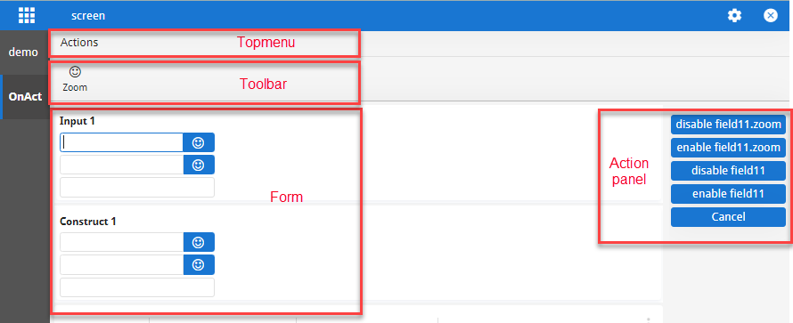 The main container displays the application. It may contain topmenus, toolbars, forms, and action panels.