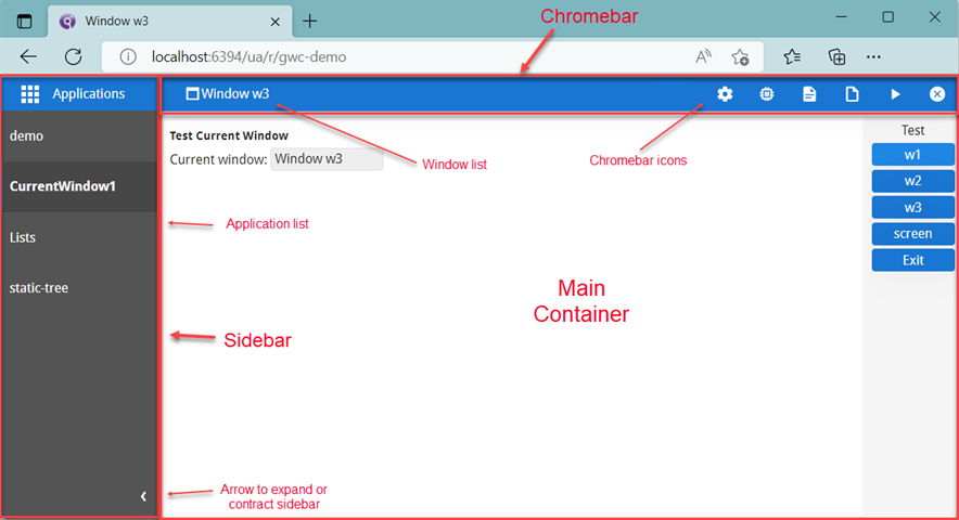 The application interface consists of a main container, a sidebar, a window list, and a chromebar.