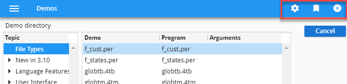 Applications in debug mode always display the debug, runInGDC, proxyLog, and VMLog icons, in addition to those set by the theme variable.