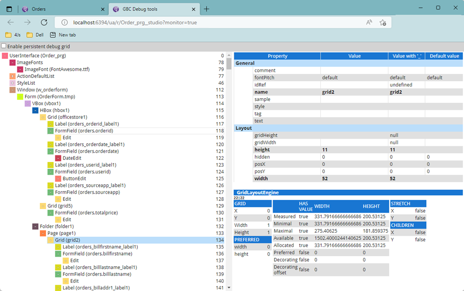 Inspecting the application user interface (AUI) tree helps you to debug and test your Genero Browser Client (GBC) application.