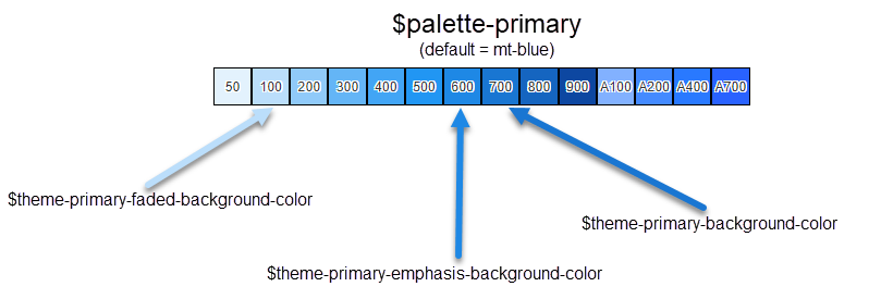 palette-primarydefines the theme color base. Its default value is$mt-blue.theme-primary-faded-background-colorhas a default value ofpalette-primary-100(which is the same as$mt-blue-100if the defaults are kept).theme-primary-emphasis-background-colorhas default value ofpalette-primary-600.theme-primary-background-colorhas default value ofpalette-primary-700.