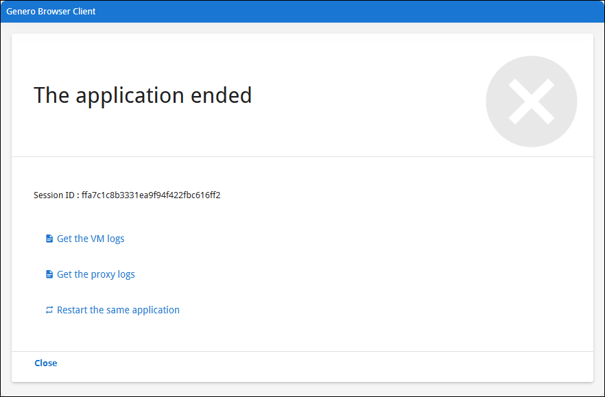 This page displays the session id (which you need to know to identify session logs for the closed application).