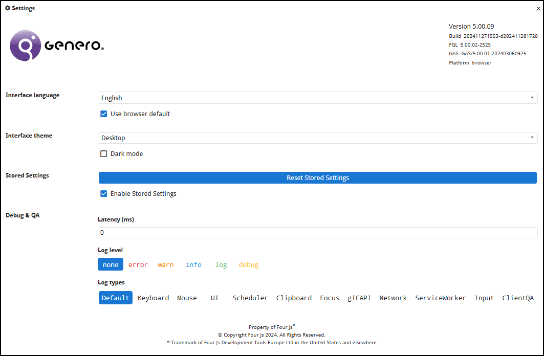 settings and debugging are solely controlled by the GDC monitor. Please refer to the Genero Desktop Client User Guide for details