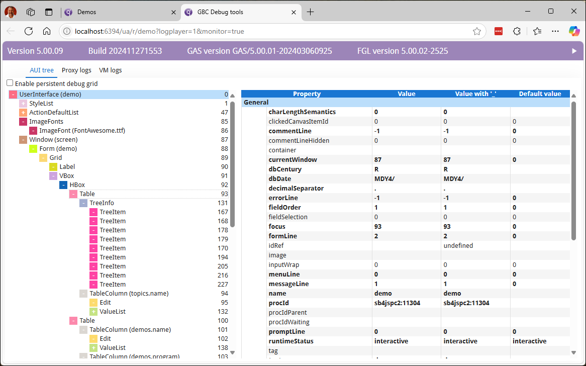 Inspecting the application user interface (AUI) tree helps you to debug and test your Genero Browser Client (GBC) application.