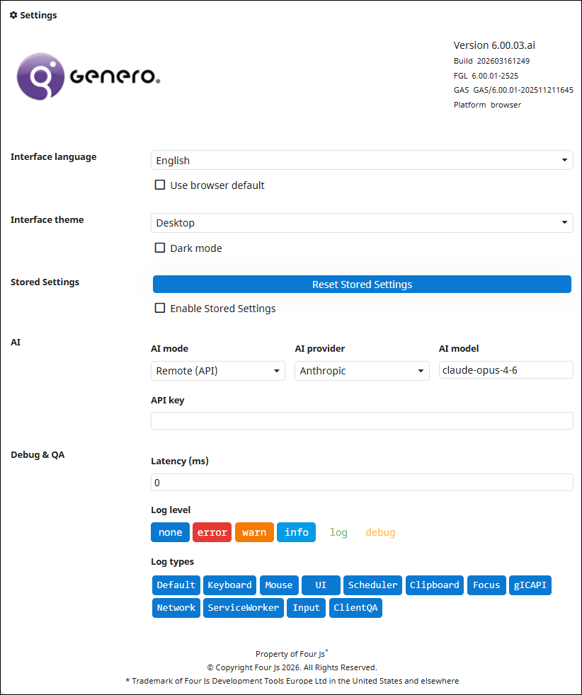 The Settings dialog header displays basic information about the versions of Genero products used. At a minimum, it displays the version and build information for the GBC client. When in debug mode, it also displays information about the runtime (FGL) version, the GAS (if available), and the platform (browser, GDC, GMA, or GMI).