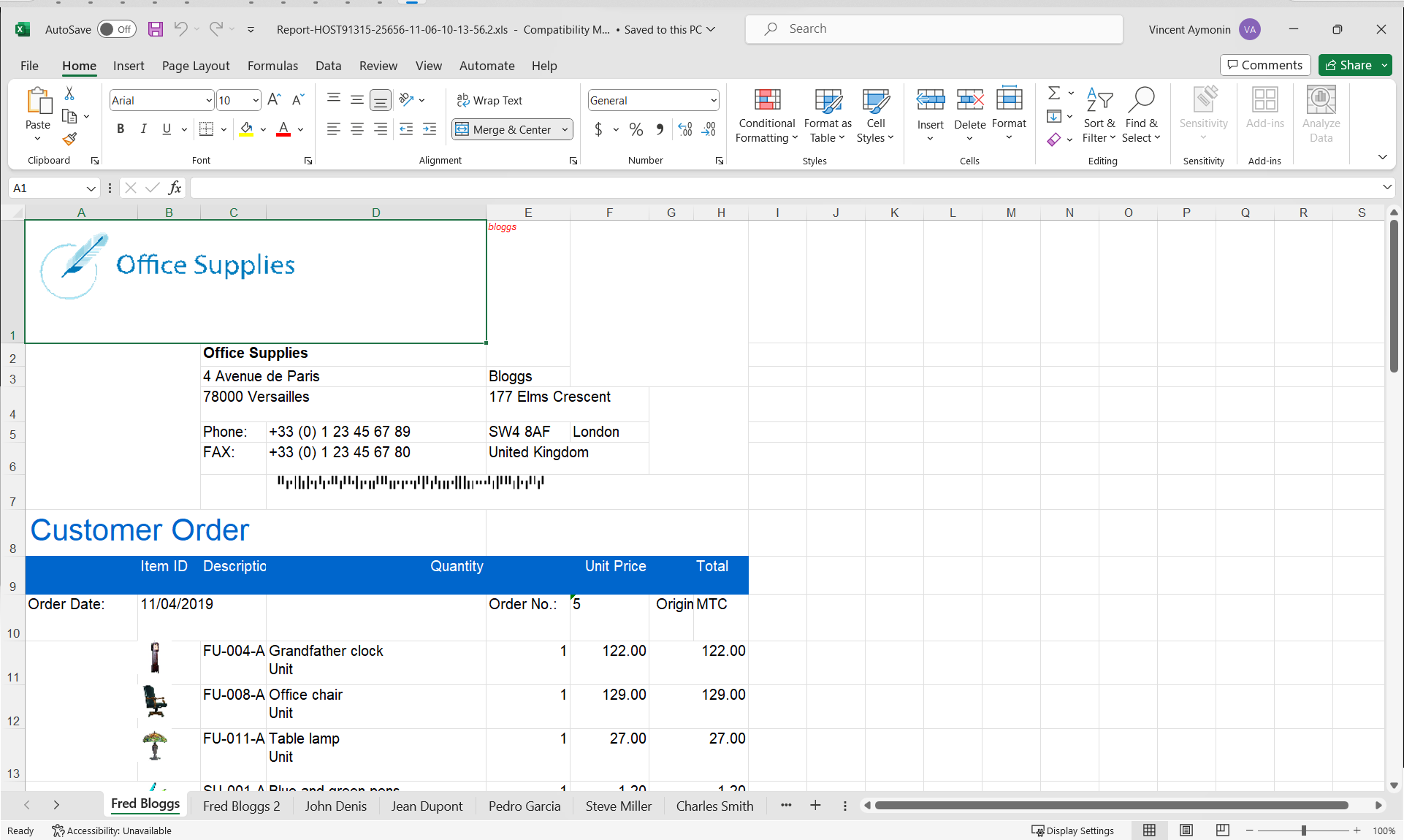 The following image shows the generated report, which is an XLS file with the sheets named depending on the clients first and last names with duplicates adding a number.