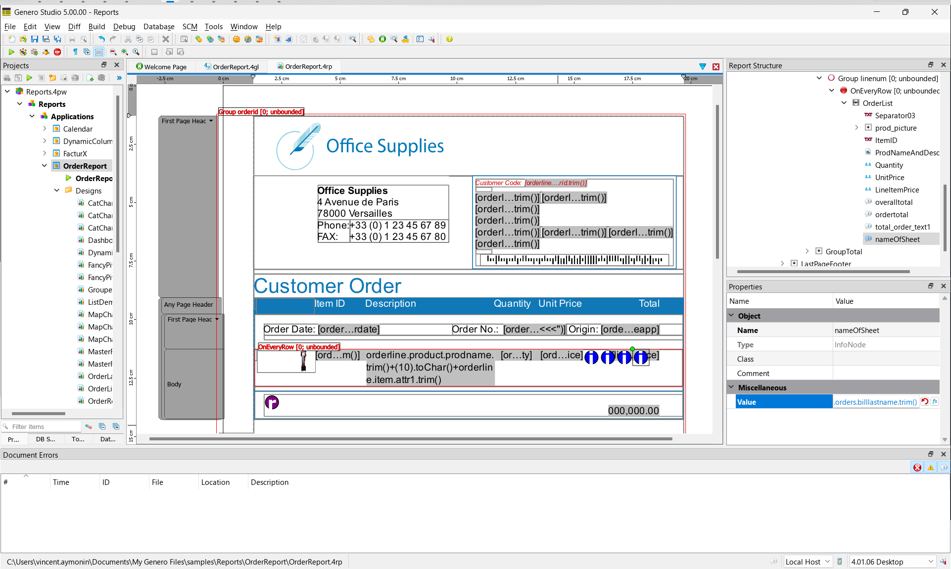 The following image shows the Report sample, within the application OrderReport and the file is OrderReport.4rp. An Infonode named nameOfSheet has been added and the value is set to name sheets with the first and last name of each client.