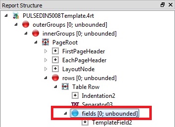 When you associate the report template schema definition with the report template, each TemplateFieldsTrigger group becomes a template field trigger. In the Report Structure view, the template field trigger displays as blue to distinguish it from other triggers. You can place items under this trigger, as in Figure 1.