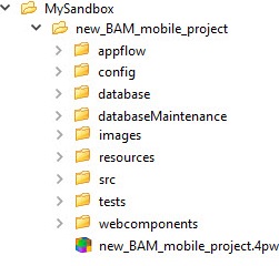 For example, Figure 3 displays the directory structure on disk for a BAM mobile project created in the MySandbox\new_BAM_mobile_project\ directory. A BAM desktop project will have a similar directory structure.