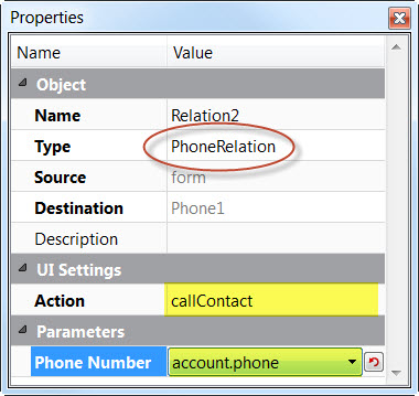 Actionproperty to callContact. Set thePhone Numberproperty to the phone column (account.phonein our example database).