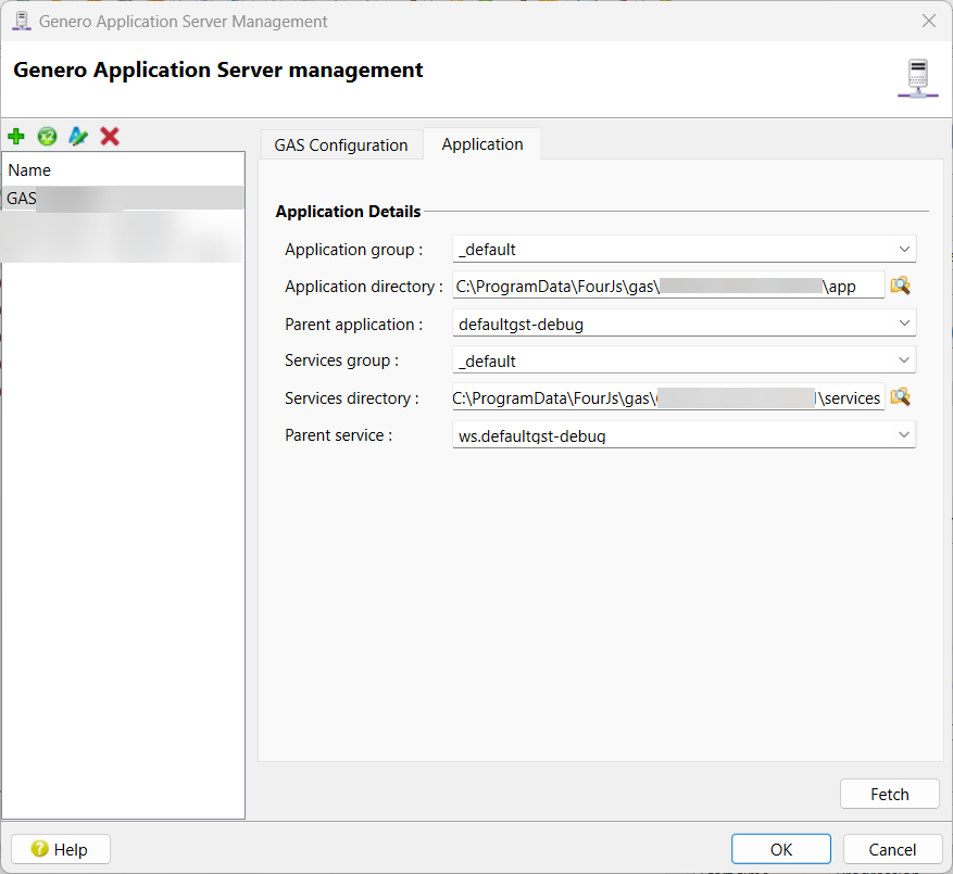If you get an error message from the fetch, verify that the GAS is started, and that the host and port values are correct. The GAS should also be configured to allow Genero Studio access to the GAS monitor. By default, the GAS monitor can only be accessed from the localhost, and Genero Studio/gsserver must be on the same machine as the GAS to access it.