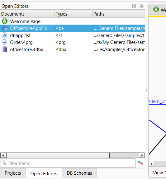 Selecting a document tab highlights it in the Open Editors view. Double-click a document in the view to navigate to it in the Documents view. Right-clicking one or more selected documents in the view triggers a context menu with actions. These actions vary depending on the selection.