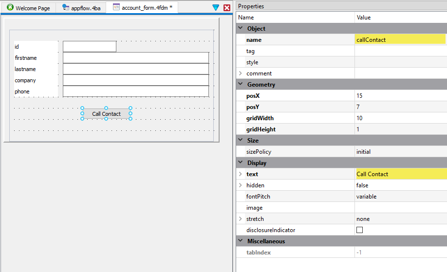callContactaction.- To make room for the button, expand the inner grid that contains the form fields.