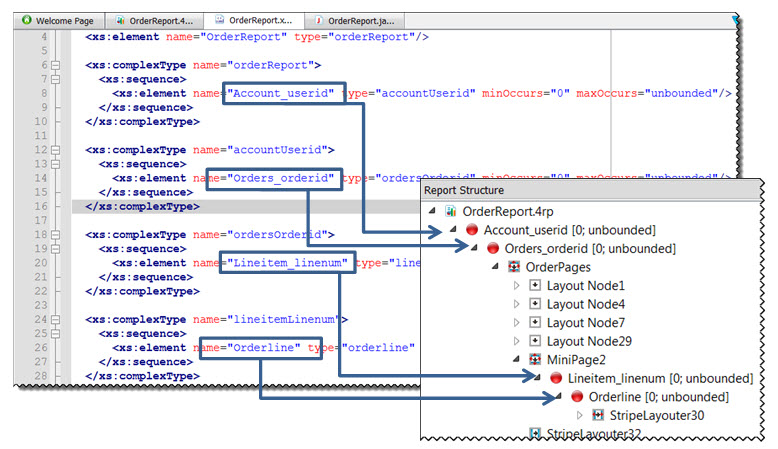 Trigger nodes are specified by the structure defined in the data schema (.xsd) file, which aligns with the hierarchy of the data in the data model. The data schema identifies the fields to be streamed with each row, as well as the fields are used to order the data. These fields become trigger nodes that display in the Report Structure as red bullets: